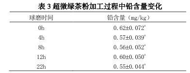 超微綠茶粉中的鉛并無顯著差異。原因?yàn)樵谇蚰ゼ庸み^程中,茶樣處于密閉空間中,且所接觸的球磨材料中鉛,所以在超微綠茶粉的加工過程中,并不會(huì)造成鉛污染。