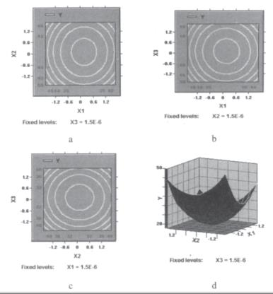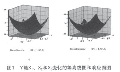 利用響應(yīng)面分析法[1]化枸杞子渣超微粉碎工藝參數(shù)。在單因素預(yù)試驗基礎(chǔ)上,用SAS軟件系統(tǒng)進(jìn)行響應(yīng)面分析,設(shè)計一個三因素五水平的回歸方程來擬合因素和指標(biāo)(響應(yīng)值)之間的函數(shù)關(guān)系。選擇球料比(X1)、枸杞子渣漿液濃度(X2)和攪拌器轉(zhuǎn)速(X3)作為因素,以粉碎后的顆粒粒度d50作為響應(yīng)值對球磨機濕法超微粉碎工藝進(jìn)行化。